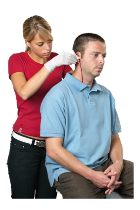 - Draai het hoofd met het bloedende oor naar beneden zodat er zich geen bloedklonter in de gehoorgang vormt.