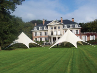 Tenten brengen ook hoogte in een feestelijk decor. Zij vullen het pittoreske plaatje op. We kunnen zelfs bepalen welke de doorslaggevende sfeer zal zijn: klassiek met zelfs een aaneenschakeling van meerdere tenten, strak zoals de piramides hierboven of als een waar tentendorp met verschillende tenthoeken in een grotere tuin.