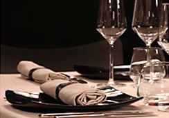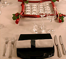 De tafel draagt een zwarte tafelrok met daarover een vison tafellaken. De zwarte borden laten zich gelden naast de zachte ondertoon van de vison servetten.