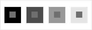Het vierkantje is in alle vier de grote vierkanten gelijk van kleur. Toch lijkt het alsof het vierkantje van links naar rechts steeds donkerder wordt door de contrastwerking van de buitenste kleuren.