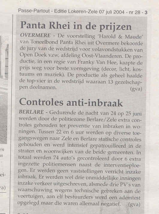 Nog groter was mijn verbazing toen ik een artikel las in het blad Passe-Partout van 7 juli 04 met de hoofding "Controles anti-inbraak" (zie bijlage) waarin werd meegedeeld dat op 24-25/06/04 een politiecontrole plaatsvond waarbij onder andere 3 onmiddellijke inningen werden opgesteld en 3 pv's van waarschuwing wegens technische gebreken aan voertuigen.