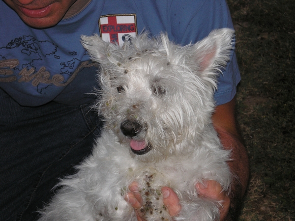 De reden:een struik met klittebolletjes,het heeft 2 uur geduurd om met ons twee de bolletjes er uit te plukken,vergezeld van het nodige gegrom ,we waren de volgende keren wel voorzichtiger....