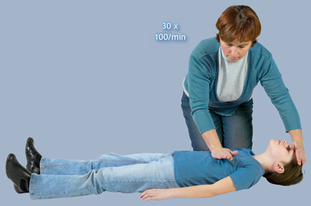 Het indrukken en het ontspannen van de borstkas moet even lang duren. Geef zo 30 hartmassages aan een tempo van ongeveer 100 hartmassages per minuut.
