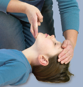 Plaats de vingertoppen van je andere hand onder de punt van de kin. Druk niet in het zachte gedeelte onder de kin, want dit kan de ademhaling bemoeilijken.