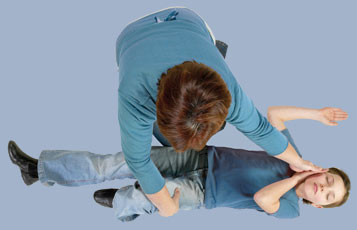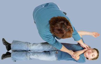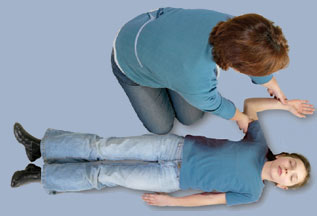 Leg het kind op zijn rug op een harde ondergrond. Kniel naast het kind. Neem plaats ter hoogte van de schouders.