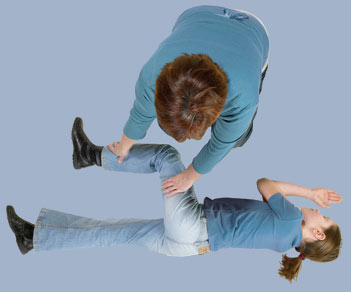 Kniel naast het kind. Zorg ervoor dat de beide benen van het kind gestrekt zijn.