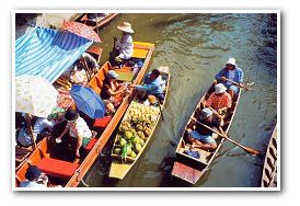 In het westelijk stadsdeel Dhonburi kan men 's morgens vroeg op de vele kanalen en grachten de " drijvende markt" aanschouwen. De laatste jaren is deze markt voor velen echter té toeristisch geworden en wordt vaak uitgeweken naar de meer authentieke drijvende markt Damnern Saduak (Damnoen Saduak), op 90 km van Bangkok Deze excursie wordt vaak gecombineerd met een bezoek aan de Rose Garden in Nakon Pathom, op 50 km van Bangkok. |