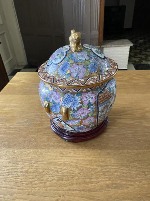 29-05-23 - Kleine ronde chinese vaas met deksel en op houten voetje
