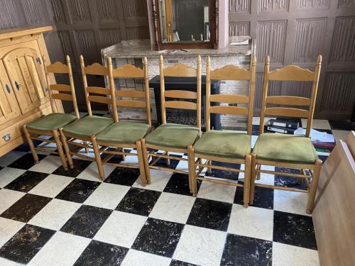 Zes eiken stoelen met fluwelen groen zitvlak. Allen in perfecte staat