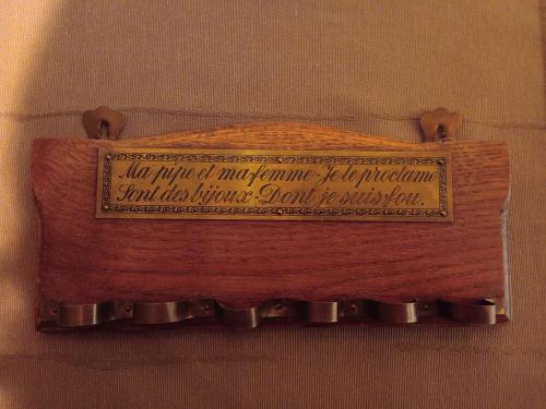 Bent u een liefhebber van klassieke pijpen? Dan is dit uw kans! Ik bied een prachtig pijpenrek aan om op te hangen (27 x 12 cm) met een inspirerende spreuk op een koperen plaatje. Dit rek biedt plaats aan zes pijpen Voor slechts 15 euro krijgt u dit unieke geheel, speciale prijs (¤50) als u de drie pijpen ook koopt. Af te halen te Wenduine.