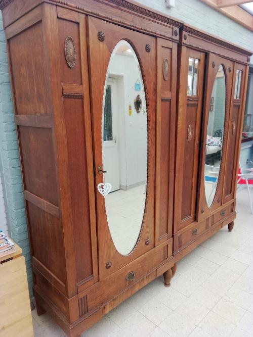 Prachtig antieke kleerkast vervaardigd uit massief hout en afgewerkt met een grote spiegel en verfijnd antiek houtsnijwerk.