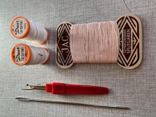 1 Zeer lange naald, 1 decouvite, 2 klosjes witte cordonet, stopgaren JAC.Samen voor 5,¤