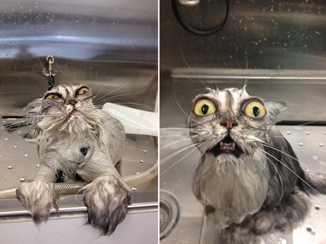 Poesjes zijn geen waterratten ... Een natte pels maakt van hen niet moeders mooiste ... De enorme ogen doen aan een uil denken : pas maar op , want ik wil niet dat je me in deze toestand fotografeert !