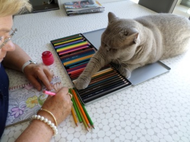 De kleurboekenrage is weer " in " , vooral voor oudere personen als bezigheidstherapie . Minneke poes geeft daarbij zelfs gratis kleuradvies . Het wordt beslist een poesvriendelijk werkstuk , want haar smaak is subtiel !