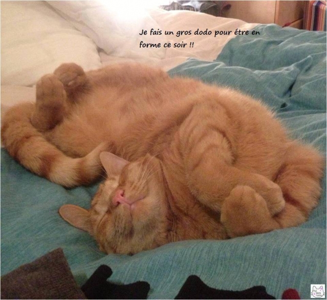 Wat een eigenaardige houding : op de rug , maar toch het kopje in een bocht en de pootjes vreedzaam tegen elkaar ... Zou dit de bloedsomloop extra stimuleren om 's avonds in topvorm te zijn ?
