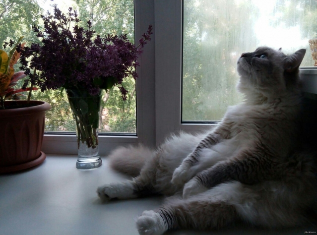 Ik kijk naar de hemel als dank voor mijn luilekkerleven ... Ik ben een verwende poes die alles krijgt wat haar hartje begeert . Zelfs bloempjes bij mijn geliefkoosd plekje aan het raam horen daarbij . Ik mag dus van geluk spreken !