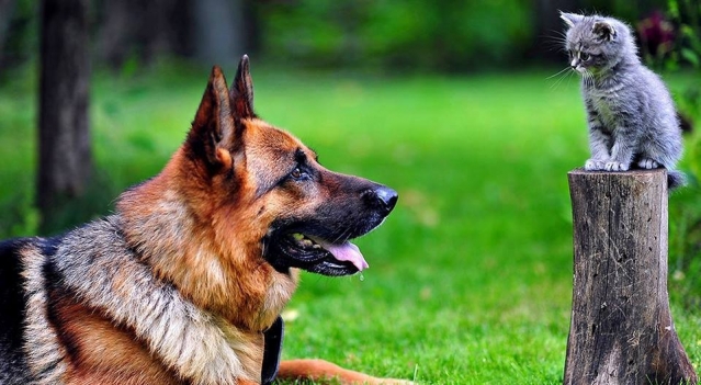 Vanop deze omgehakte boomstam kijk ik neer op Woef die in het gras ligt ... Wil hij mijn vriendje zijn ? Ik ben nog klein en hij is groot , maar als we op deze manier kunnen communiceren , zal het wel best meevallen . Verschillen verdwijnen dan als mist voor de zon !
