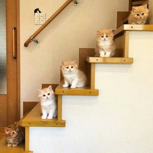 Zijn we niet ongelooflijk snoezig : ieder op een trede van een houten trap ... Centraal poseren kittens die ook wat wit in hun pelsje integreren . Onderaan kijkt het poesje niet naar de fotograaf : het is afgeleid door ... Bovenaan pronkt de leider : hij zorgt dat de groepsfoto geslaagd is !