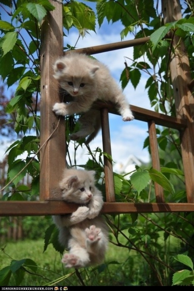 Wat zijn we tevreden met ons klimrek ... We trainen onze spieren en ons evenwicht in een groene omgeving . Deze ervaring zal zeker nog nuttig zijn als we op eigen benen staan . Jong geleerd , is oud gedaan !