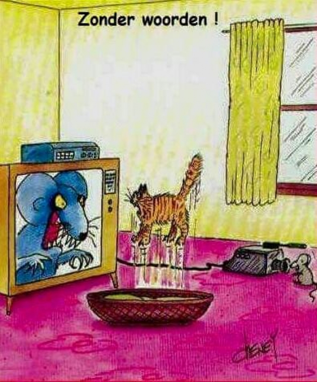 Is dit Mickey Mouse die veranderd is in Dracula ? Daardoor spring ik een gat in de lucht en mijn hart bonst als een gek ... Mag ik geen muisjes meer vangen ? Daar word ik muisstil van !