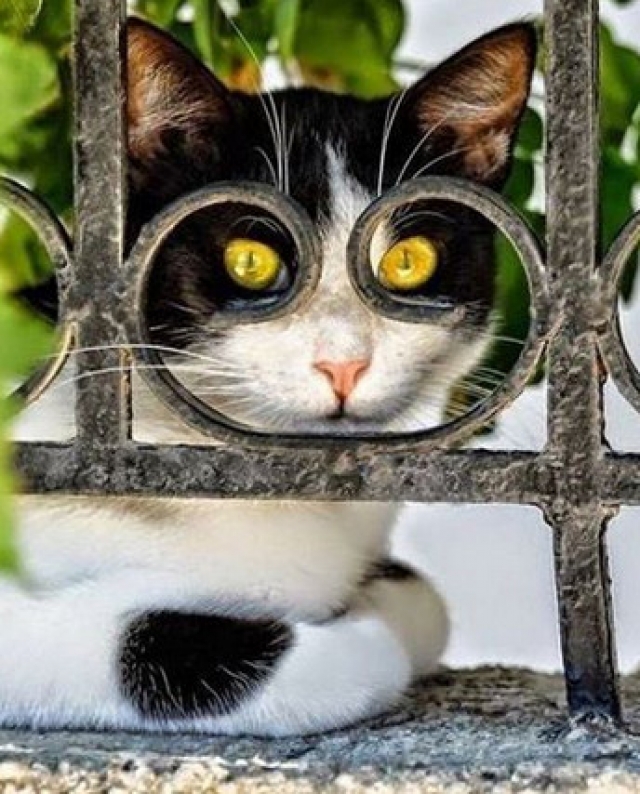 Deze foto bewijst dat een poes via het hekwerk een oogje in 't zeil kan houden . Zij weet de open ruimten daarin optimaal te benutten : haar ogen passen in de krullen en daardoor lijkt het alsof ze een bril draagt wat erg komisch is . Haar gele oogjes stralen licht uit : opgelet dus !