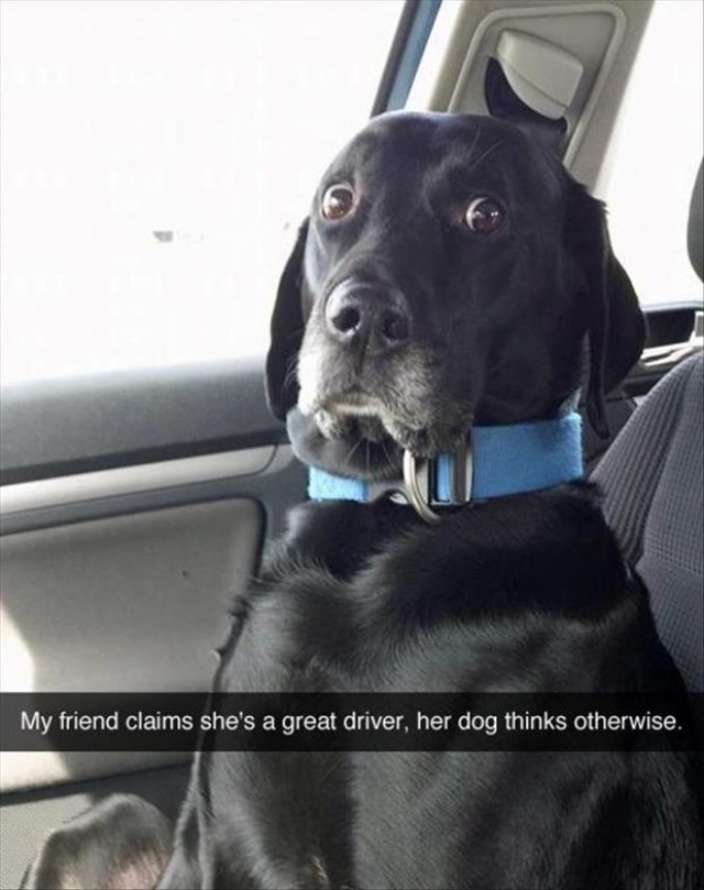zij denkt dat ze goed kan rijden..... de hond heeft zijn twijfels