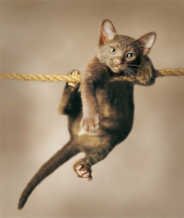 Ben ik een koorddanser die even uitgegleden is , maar zich toch nog heeft kunnen vastklampen ? Deze koord hoort bij mijn dagelijkse gymnastiekoefeningen . Beperkt risico : een poes komt altijd op haar pootjes terecht !