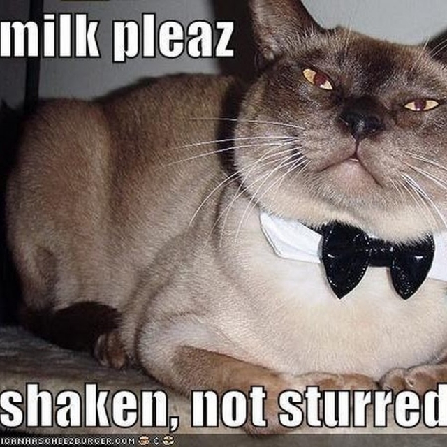 Waarom verdien ik geshakete melk : dus niet geroerde melk ? Ik ben een aristokat : dat merk je meteen aan mijn strikje en mijn mollig lichaam . Ik hou van kwaliteitsproducten en wens het neusje van de zalm !