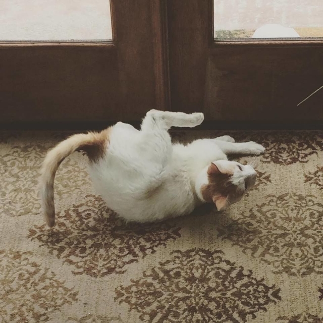 Als ik niet buiten mag , ga ik rollebollen voor de deur om mijn frustraties af te reageren ... Ik oefen dan al mijn spieren en neem rare poses aan . Wat vind je van mijn opgeheven achterpoot en mijn naar beneden gerichte staart ? Als je glimlacht , open dan de deur voor je creatieve vriend !