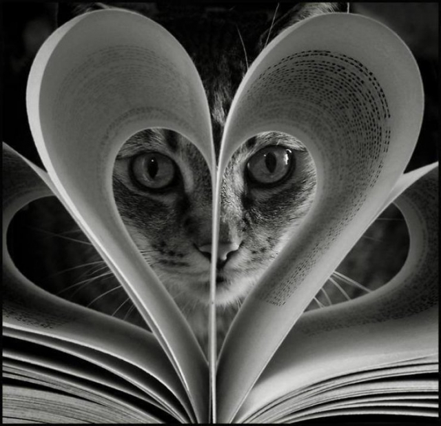 Hoe poëtisch vind je mijn snoetje nu ik door hartvormige tekstblaadjes gluur ? Weet je dat de liefde voor de poes ook langs de maag passeert ? Geen woorden maar daden interesseren mij : ik wil eten !