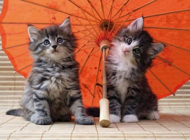 Zijn we niet schattig onder moeders paraplu ? We voelen er ons kiplekker onder : beter beschut tegen de zon en de wind . Het rechtse poesje houdt zijn kopje een beetje schuin en vraagt je om een knuffel , terwijl het andere met je wil spelen . Zo'n aanbod mag je niet weigeren !