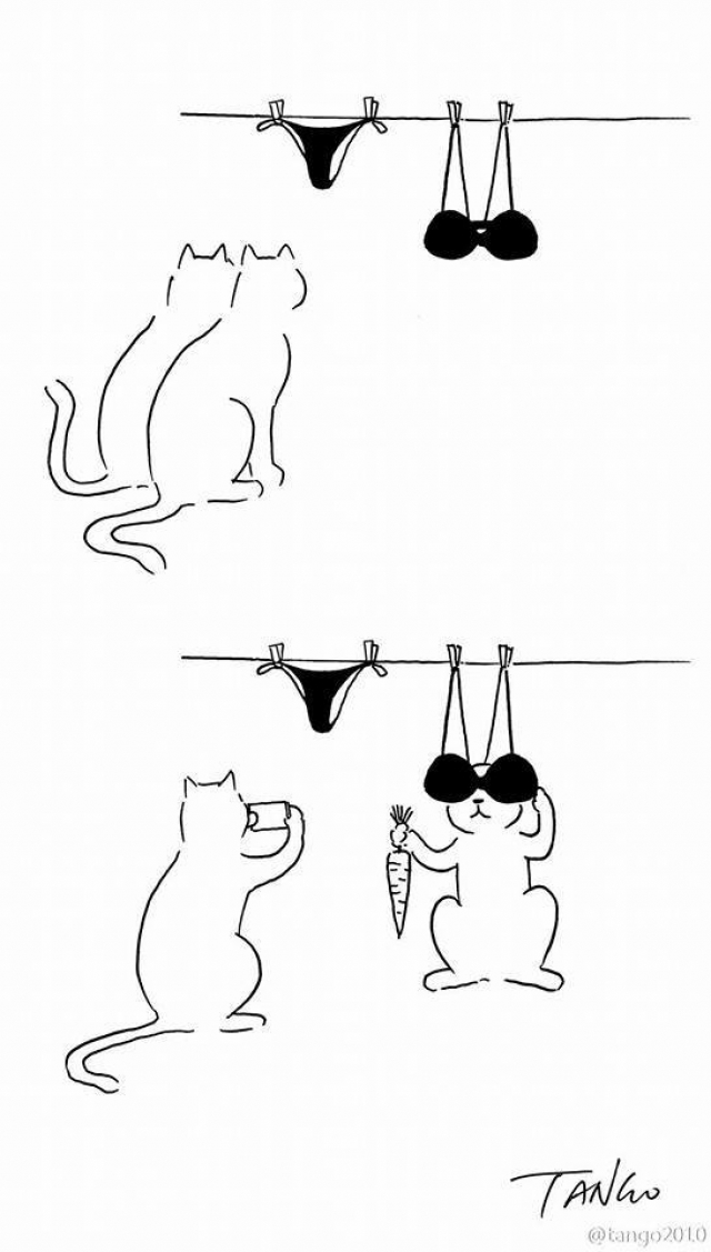 Is een bikini wel sexy voor poesjes ? Zij interpreteren het op hun manier : het BH 'je wordt een enorme zonnebril , het slipje is niet nodig en centraal staat een grote wortel ... De visie van een grapjas !