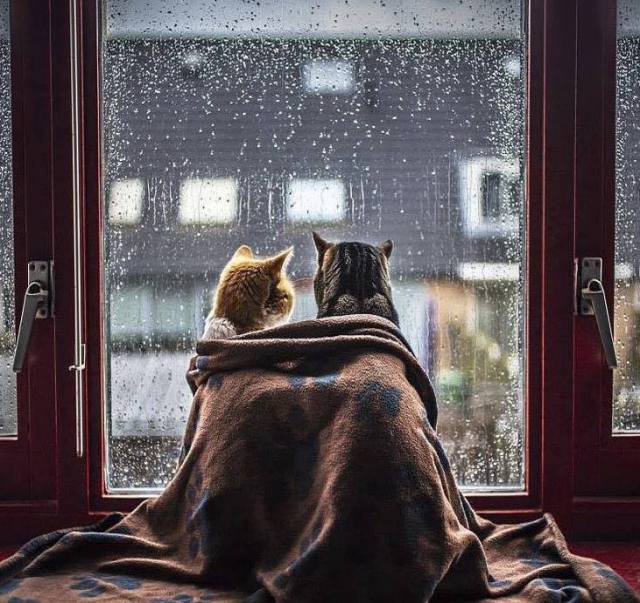 Voel je ook de trieste sfeer als het zonder ophouden pijpenstelen regent ? Ook wij snakken naar een beetje warme zon . Om die warmte te compenseren kruipen we onder een dekentje en observeren de straat . Misschien gebeurt er wel iets boeiends ...