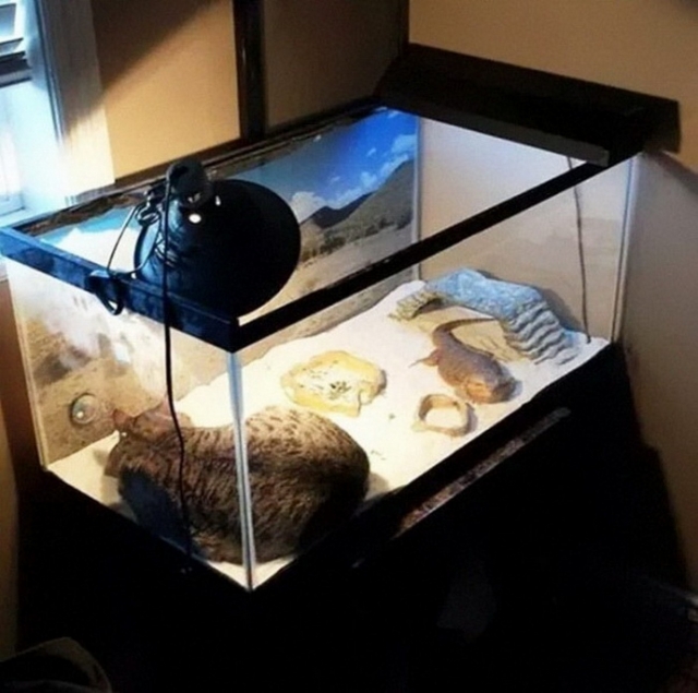 Opdat het aquarium vlugger zou drogen na een grondige poetsbeurt , wordt er bovenaan een grote lamp bevestigd die extra warmte verspreid . Ik maak dan ook onmiddellijk gebruik van deze unieke gelegenheid om me er comfortabel te nestelen . Als de visjes dit zien , schrikken ze zich een aap !