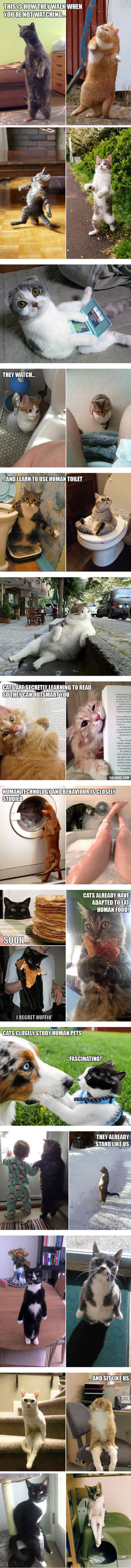 Gaan poezen ons beter kunnen nabootsen in de toekomst ? Ze zijn volop onze gedragingen aan het bestuderen en slagen er al goed in als we er niet zijn ... Het zijn slimme beestjes die op deze manier ons hart willen veroveren : grappig en schattig staan op de eerste plaats in hun woordenboek !