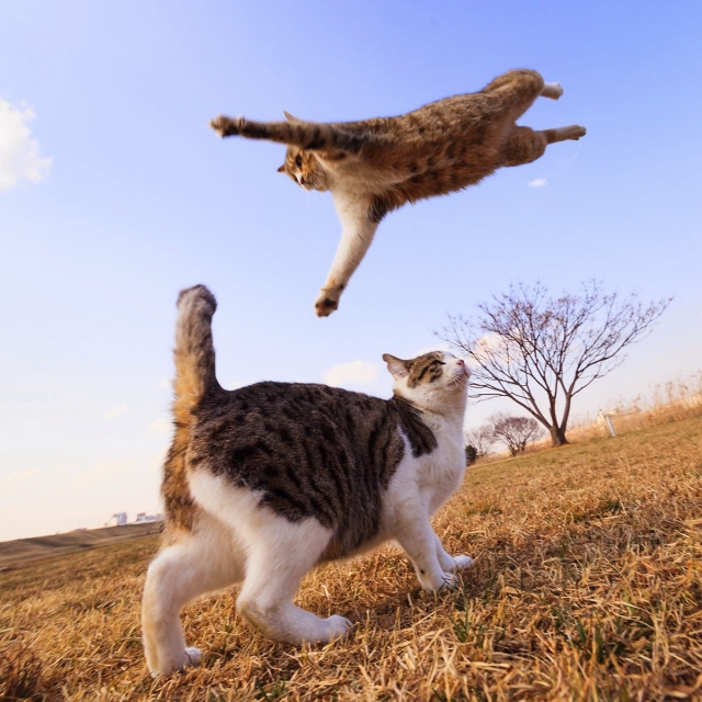 Terwijl Felix de andere kant uitkijkt , vlieg ik gezwind door de lucht om mijn onvoorzichtige prooi niet te laten ontsnappen ... Hij moet maar meer attent zijn : het volstaat niet om met je staart te zwaaien !