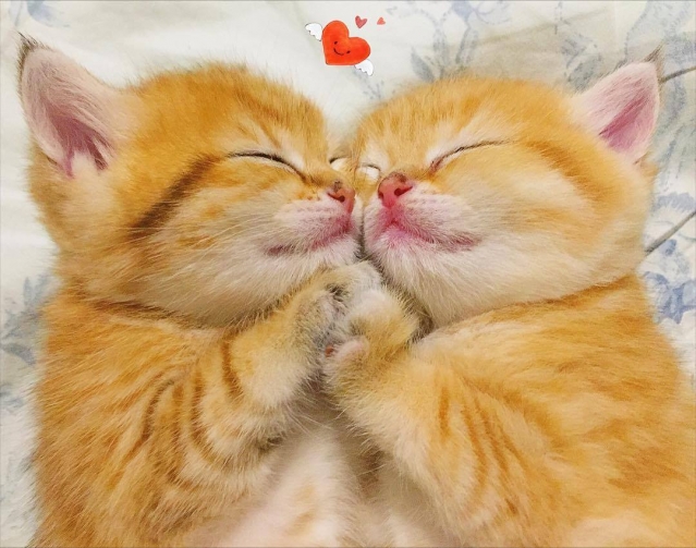 Het is terecht dat er een hartenengeltje boven de snoezige snuitjes van deze poesjes fladdert . Hun dromen zijn zeker honingzoet , zo dicht bij elkaar . Krijg jij ook een vertederend gevoel van deze twee dikke vrienden ?