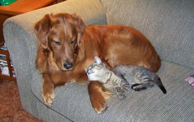 Ik kijk naar Woef , maar hij lijkt me in gedachten verzonken ... Samen op een zachte zetel liggen , vind ik een zalig moment : het bevestigt onze vriendschap . Zal ik lekker spinnen zodat hij ook hij zich prima voelt ? Vrienden zijn er voor elkaar !