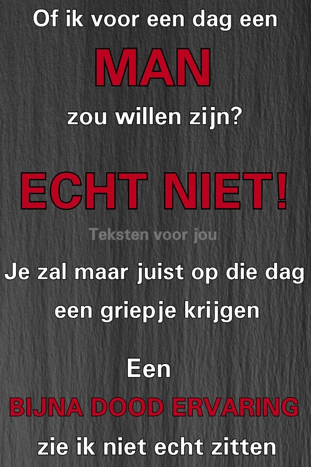 De vrouw zegt, ja lap het is weer zo ver, weer een bijna dood ervaring, en ik heb er echt geen zin in om in zijn plaats dood te liggen gaan in een kist, NEE ik zou voor geen enkele dag een man willen zijn