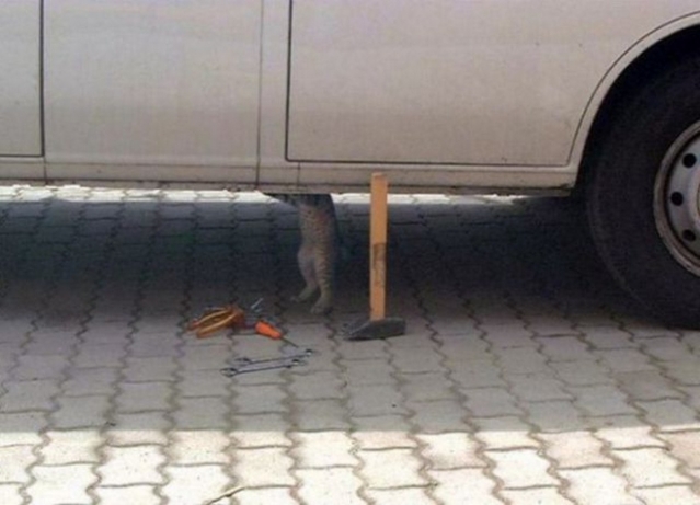 Af en toe leidt mijn inspectietocht me naar de onderkant van auto's ... Met al die snelheidsdrempels heeft deze plek het hard te verduren en zijn kleine herstellingen nodig . Ik wil mijn steentje bijdragen en steek er mijn neus in . Zo weet men meteen waar het schoentje knelt !