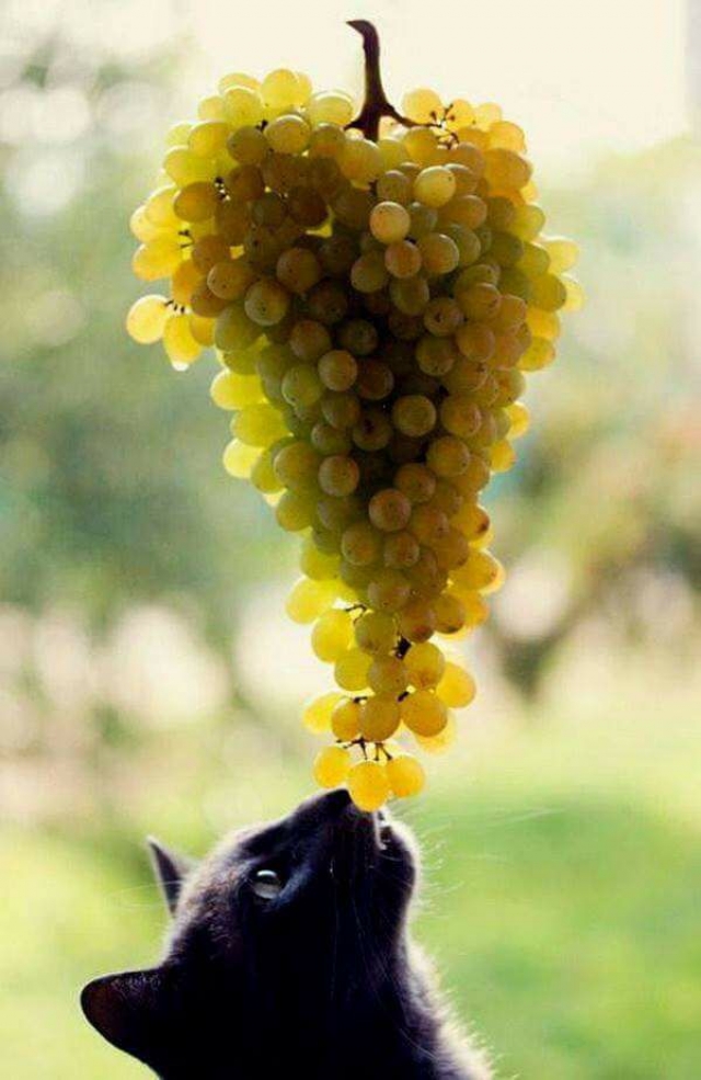 Mijn neusje ruikt rijpe druiven ... Zou ik die lusten ? De gele kleur en zoete geur trekt me wel aan . Ik hap er eentje af en proef ... Mmm... lekker , maar er zitten pitjes in ! Die spuw ik uit . Nog eentje ?