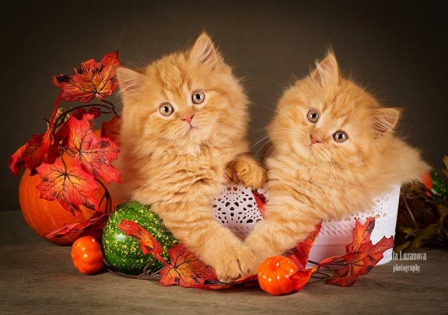 Wat een geschenk : een knappe , rosharige poezentweeling die je hart steelt ... Tussen deze herfstsymbolen tonen we onze verbondenheid door een voorpootje op dat van de ander te leggen . Laten de mensen ons voorbeeld volgen : met vrienden is het veel gezelliger !