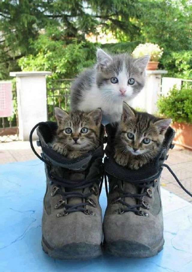 Lekker beschut in de warme bottines wil de tweeling niet wijken ... Daarom spring ik er bovenop . Met onze blauwe oogjes vormen we een lief tafereel voor de foto . Lees het boek : " I love happy cats " De poezenfluisteraar weet raad voor alle probleempjes !