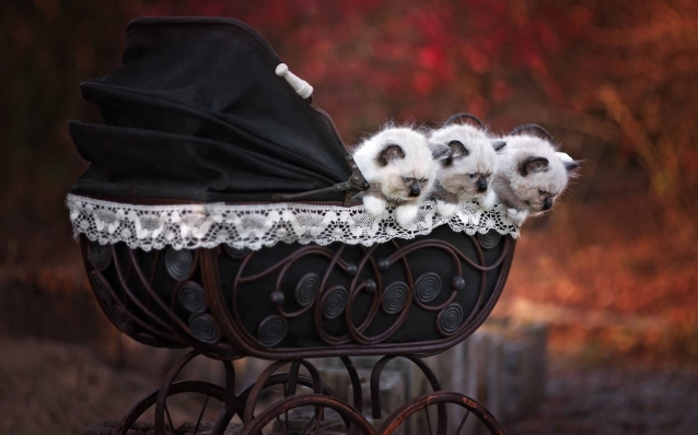Drie op een rij snoezige poezenkopjes in een hoge , mooi versierde kinderwagen doet je hart onmiddellijk smelten , he ? Toch kijken ze bezorgd naar beneden , want ze vinden de afstand naar de grond moeilijk overbrugbaar ... Wie van deze drie dotjes neemt het initiatief ?