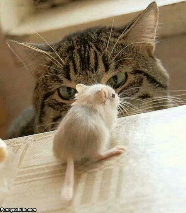 Dat ziet er gevaarlijk uit ... poezen lusten nu eenmaal muisjes ... Gaat er zich een drama afspelen of blijft het een vreedzame ontmoeting ? De spanning stijgt ten top !