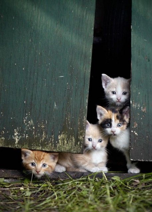 Vier snoezige kittenkopjes komen voorzichtig piepen van achter een oude schutting . Heel verwonderd kijken ze rond , want ze moeten nog aan de omgeving wennen . Samen voelen ze zich sterker en daarom blijven ze bijeen . Wat leren ze vandaag ?