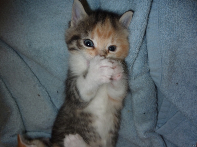 Ben ik niet charmant ? Ik lig op mijn rug op een zacht deken en houd mijn voorpootjes samen voor mijn mondje . Ik heb een geheimpje , maar wil het je niet verklappen . Alsjeblieft !!!
