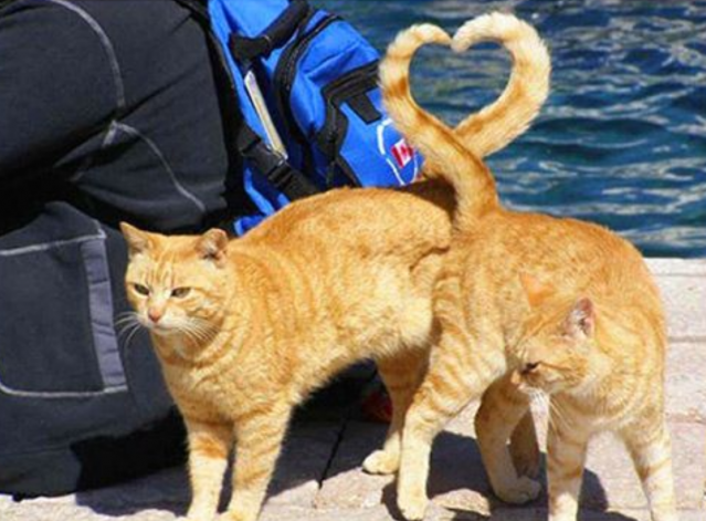 Dit is een voorbeeld van poeselijke creativiteit : met onze staartjes vormen we een schattig hartje ... Je moet maar op het idee komen ... Als tweeling kunnen we elkaar niet missen en zo tonen we onze vriendschap . Liefde is alles wat we nodig hebben !
