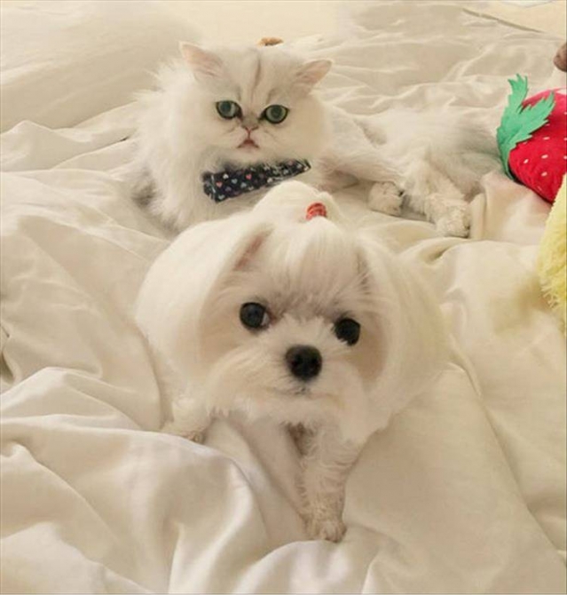 Spierwit en een schattig snuitje werkt ongetwijfeld betoverend ... Hoewel Woef op het voorplan staat , fascineren mijn oogjes meer . De accessoires , die men heeft toegevoegd : een rood elastiekje of een strikje met hartjes op typeren ons . De hartendief wint natuurlijk . Toch zijn we broers van een andere vader !
