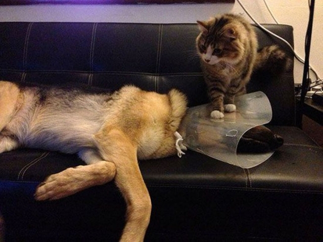 Woef laat zich gaan nadat hij van de veearts kwam en neemt mijn plekje in de zetel in . Dat is de druppel die de emmer doet overlopen en ik besluit hem te pesten .. Ik roffel met mijn voorpootjes op zijn plastieken kopkapje : schuif onmiddellijk op , dan is er geen vuiltje aan de lucht !